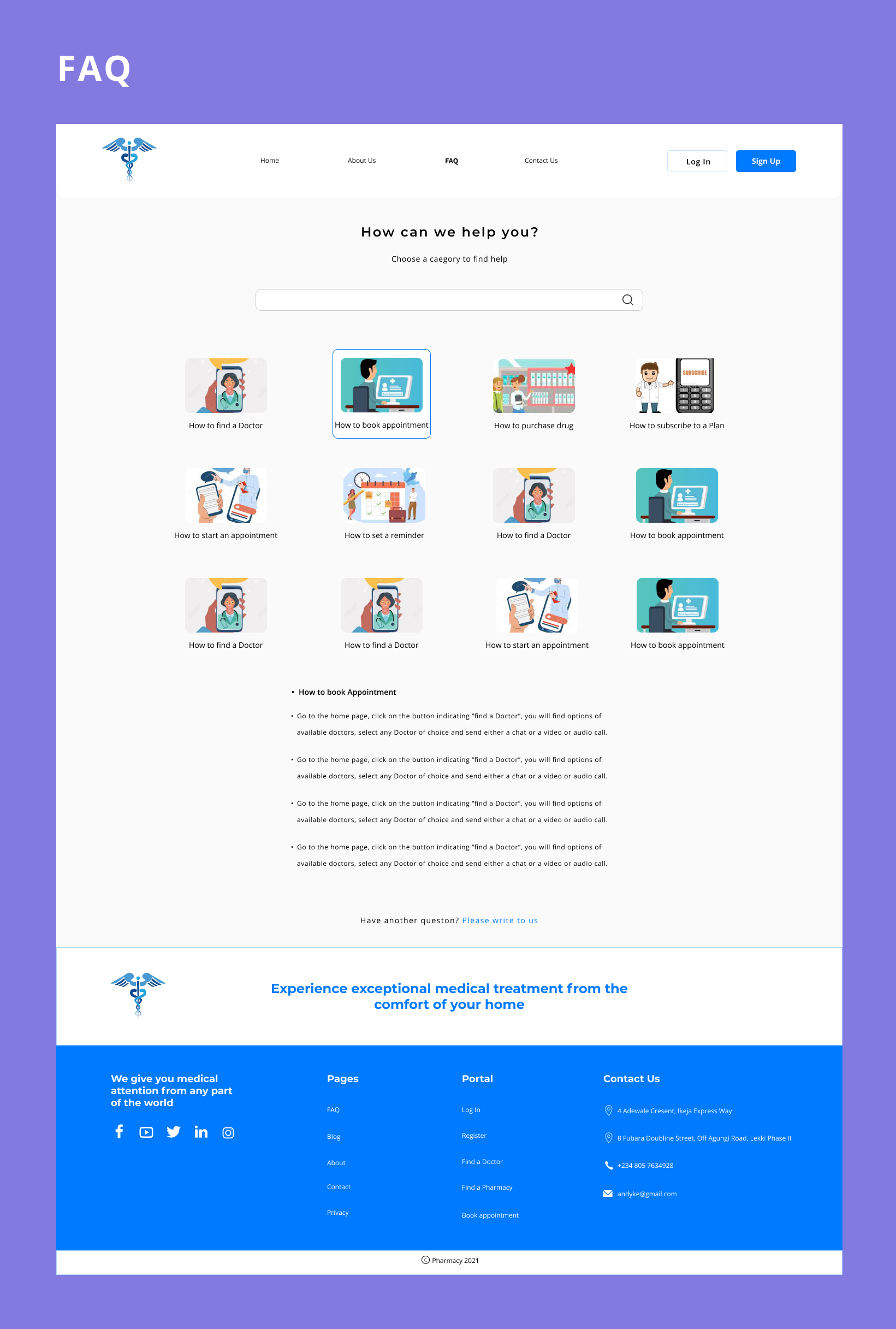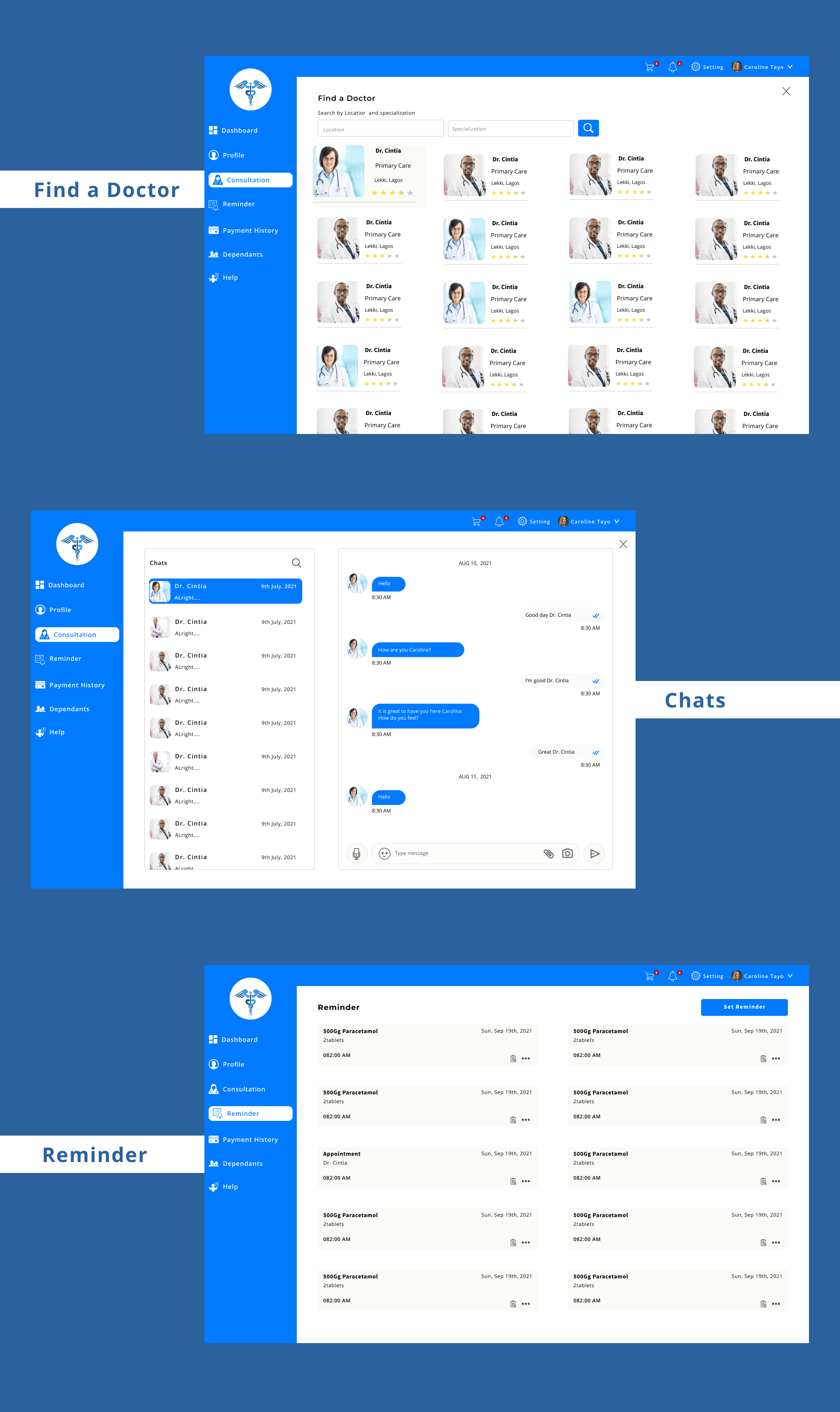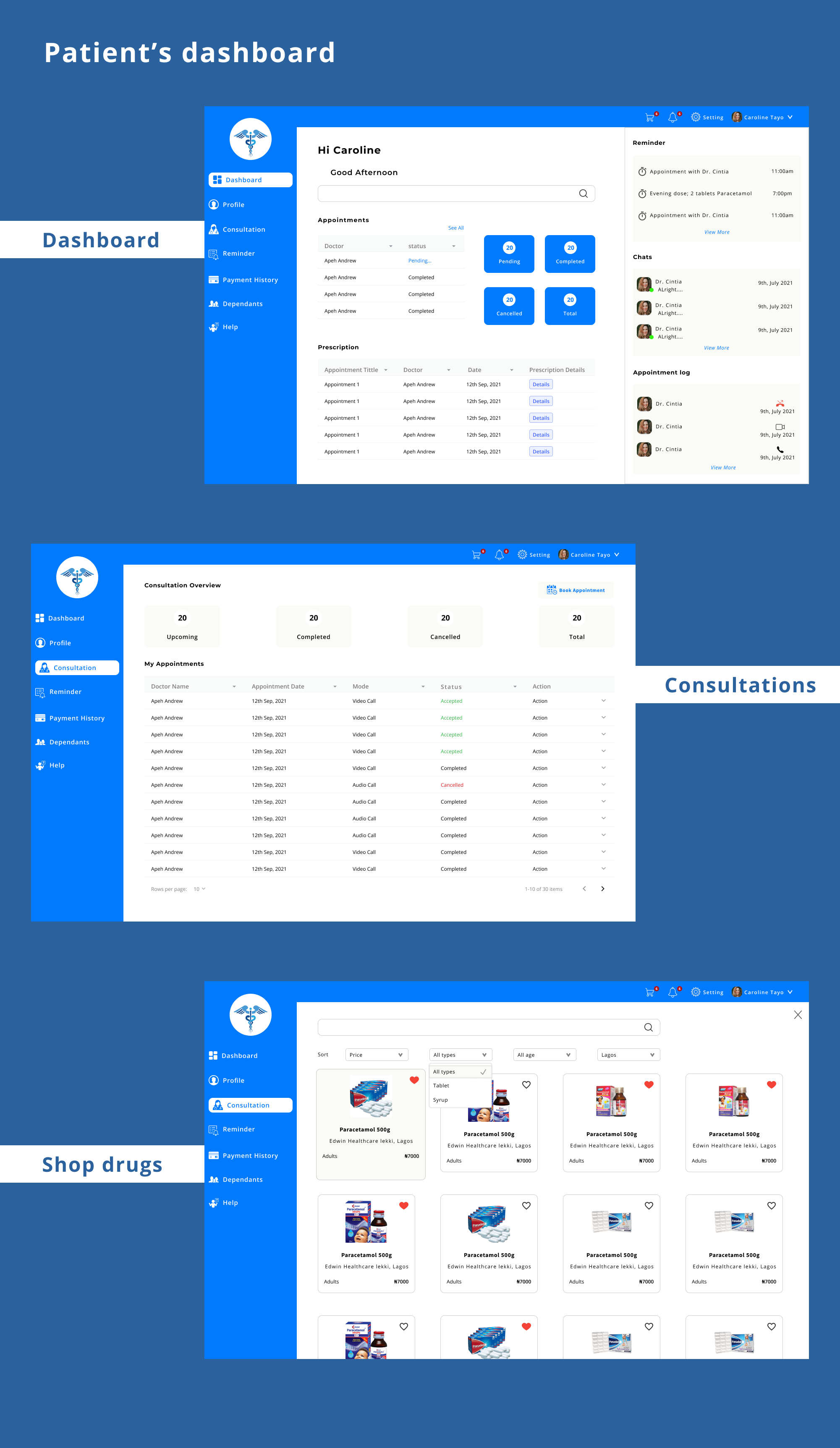 Patients will be able to find a doctor and book an appointment with them. After each session, the Doctor prescribes drugs for them and sends them. They receive the prescription and order them from the online pharmacy that gets them delivered to their homes.