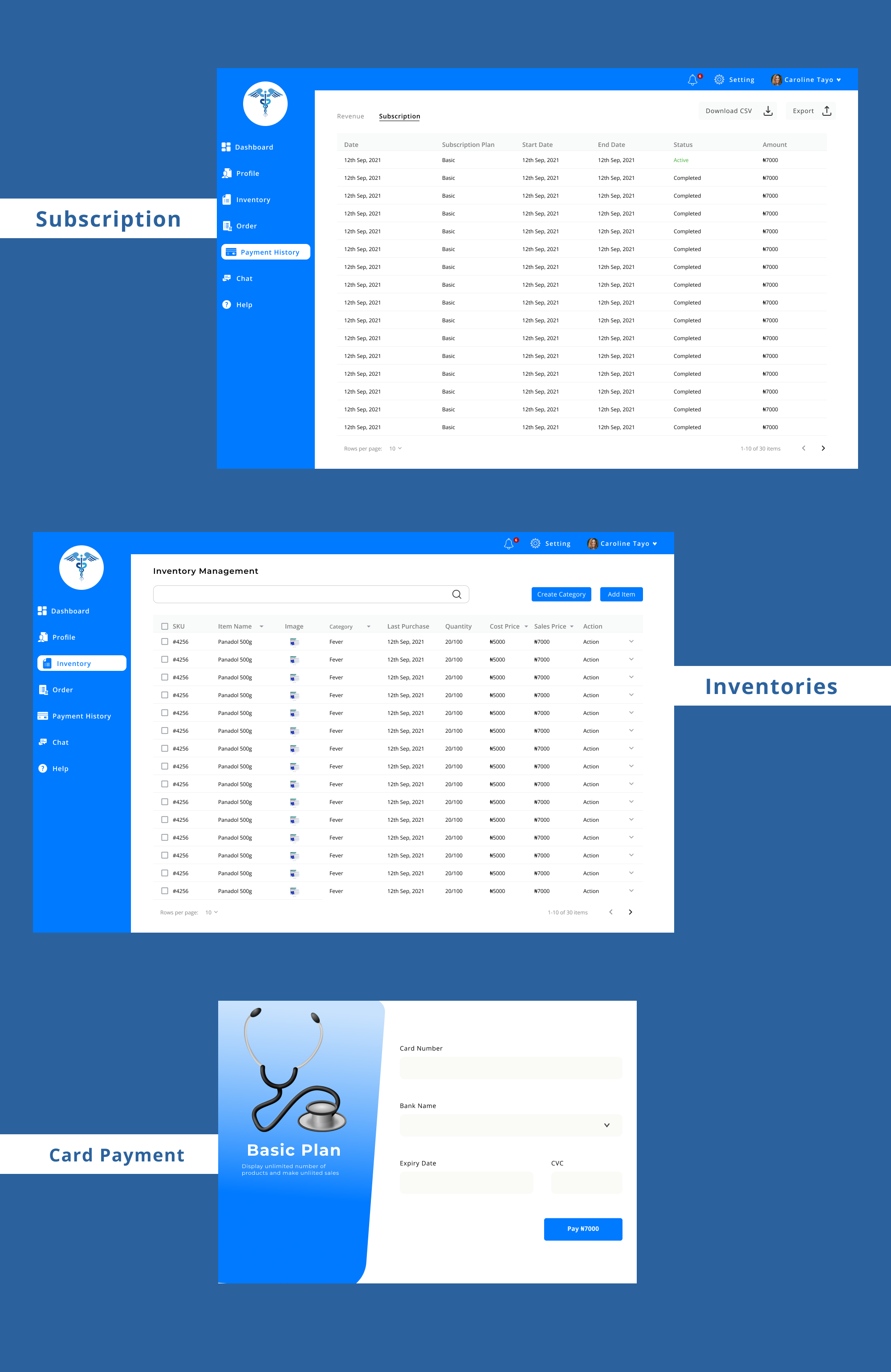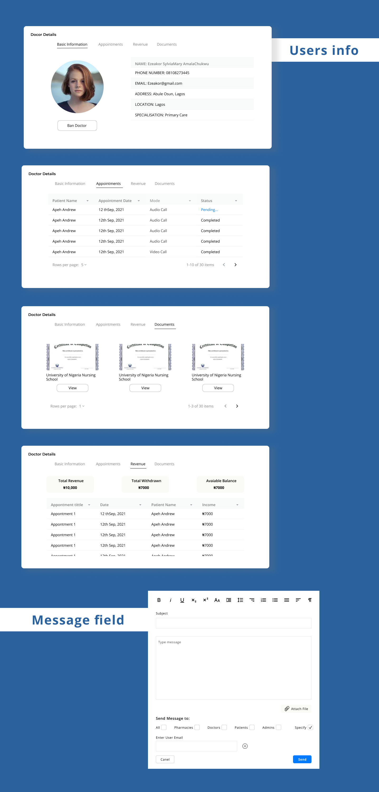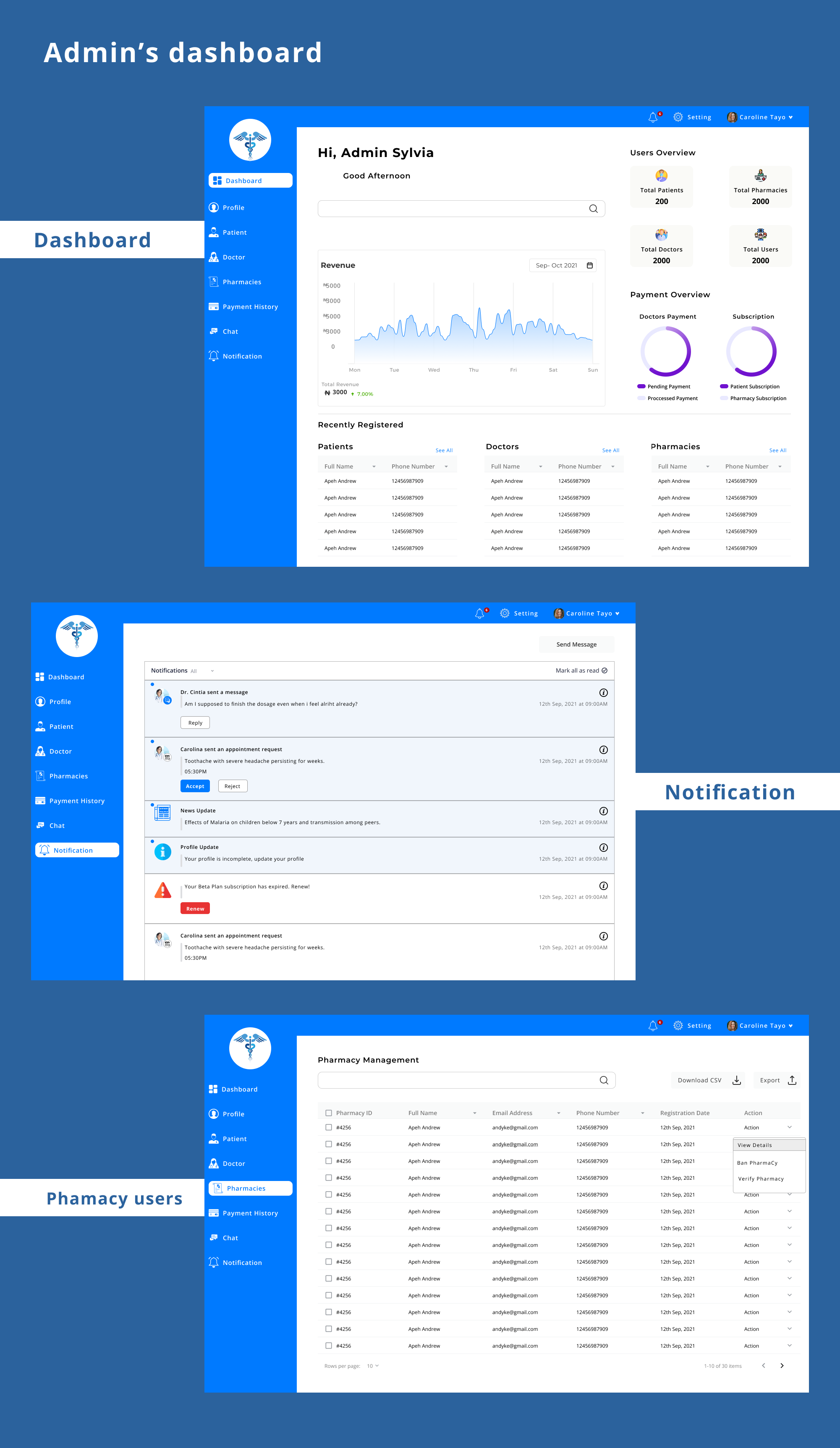 Admins manage all users of the app; Patients, Doctors, and Pharmacies. They can ban a disable a user, verify a Doctor and view all activities in the app.